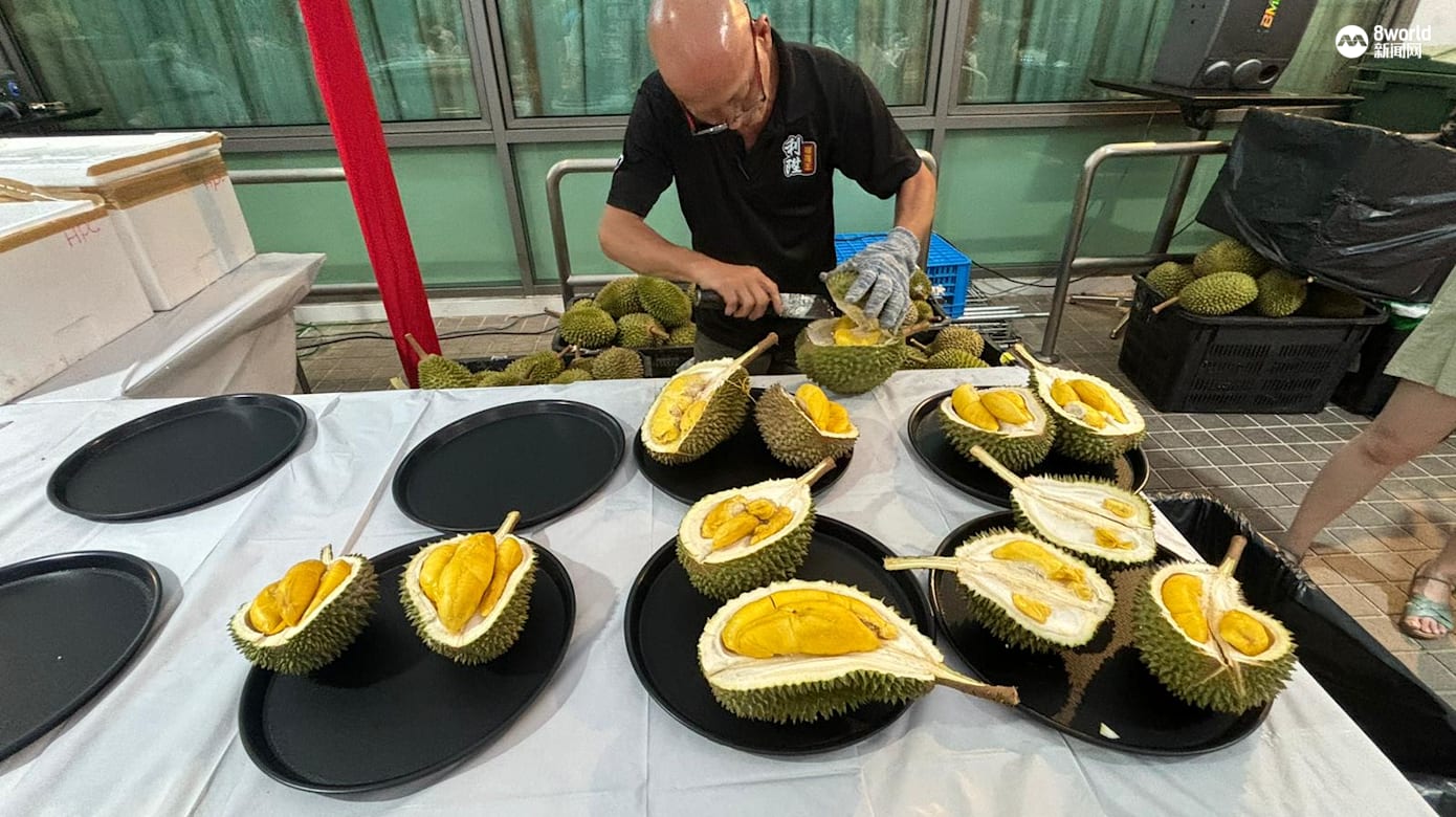 醉花林今晚一共准备了约500公斤的马来西亚彭亨猫山王、五箱的泰国山竹,以及250个泰国椰子,免费供来宾享用。