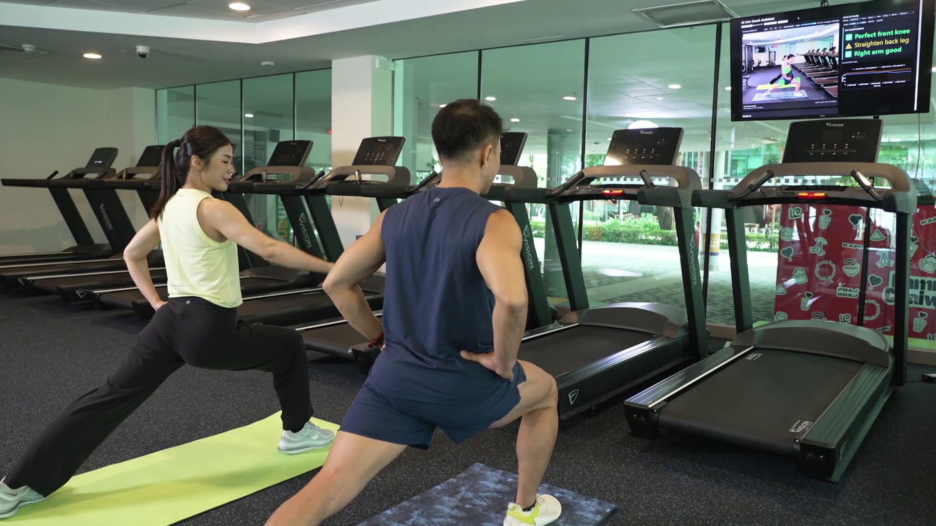 身为主持人兼瑜伽老师的郑六月,通过AI运动系统,教导健身教练施伟杰一些瑜伽动作。