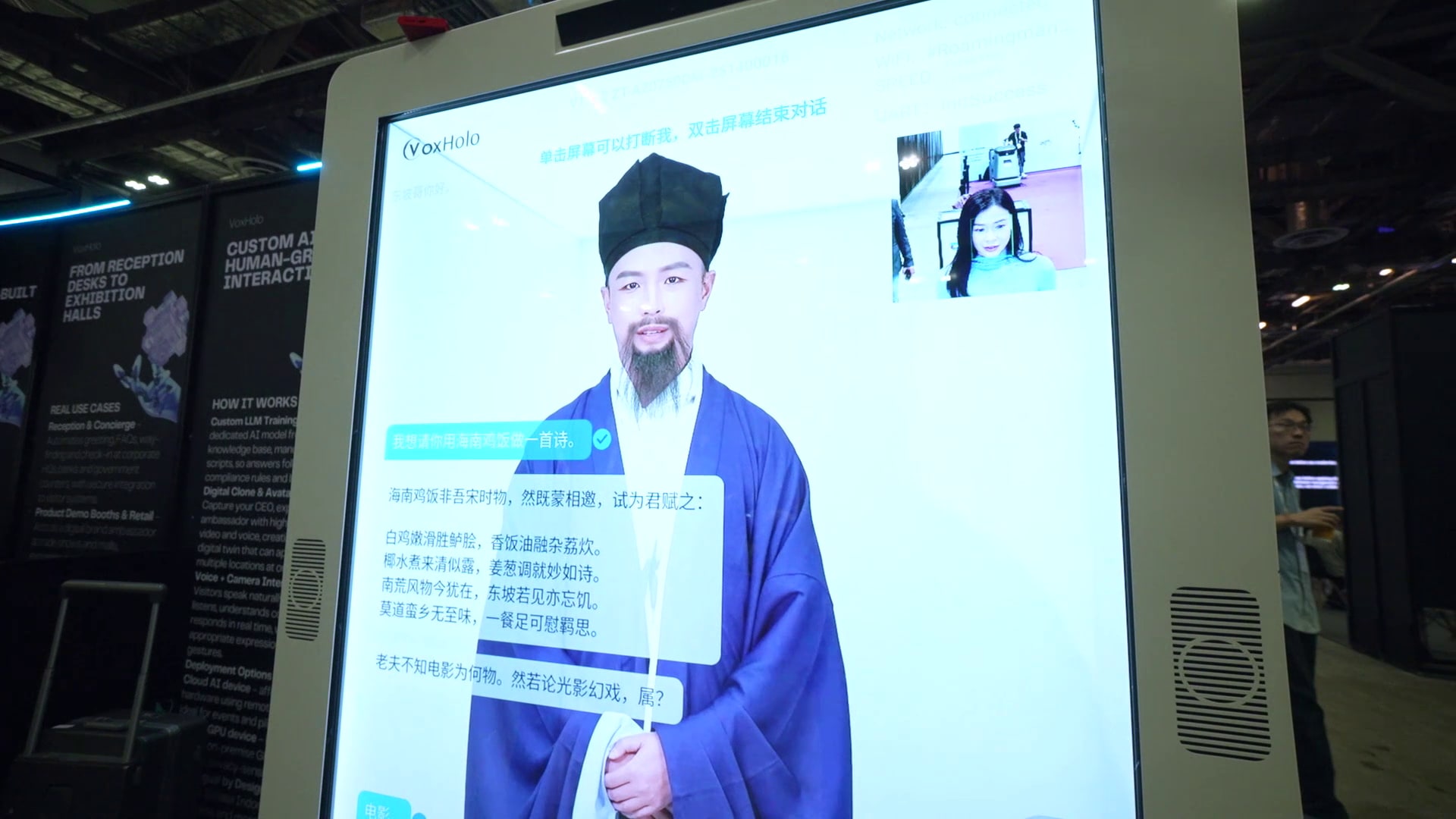 AI数字人“苏东坡”,能够实时对话、即兴作诗,甚至能以现代元素入题创作。主持人郑六月提出“用海南鸡饭写一首诗”的请求时,“苏东坡”便迅速生成一段古风诗句。