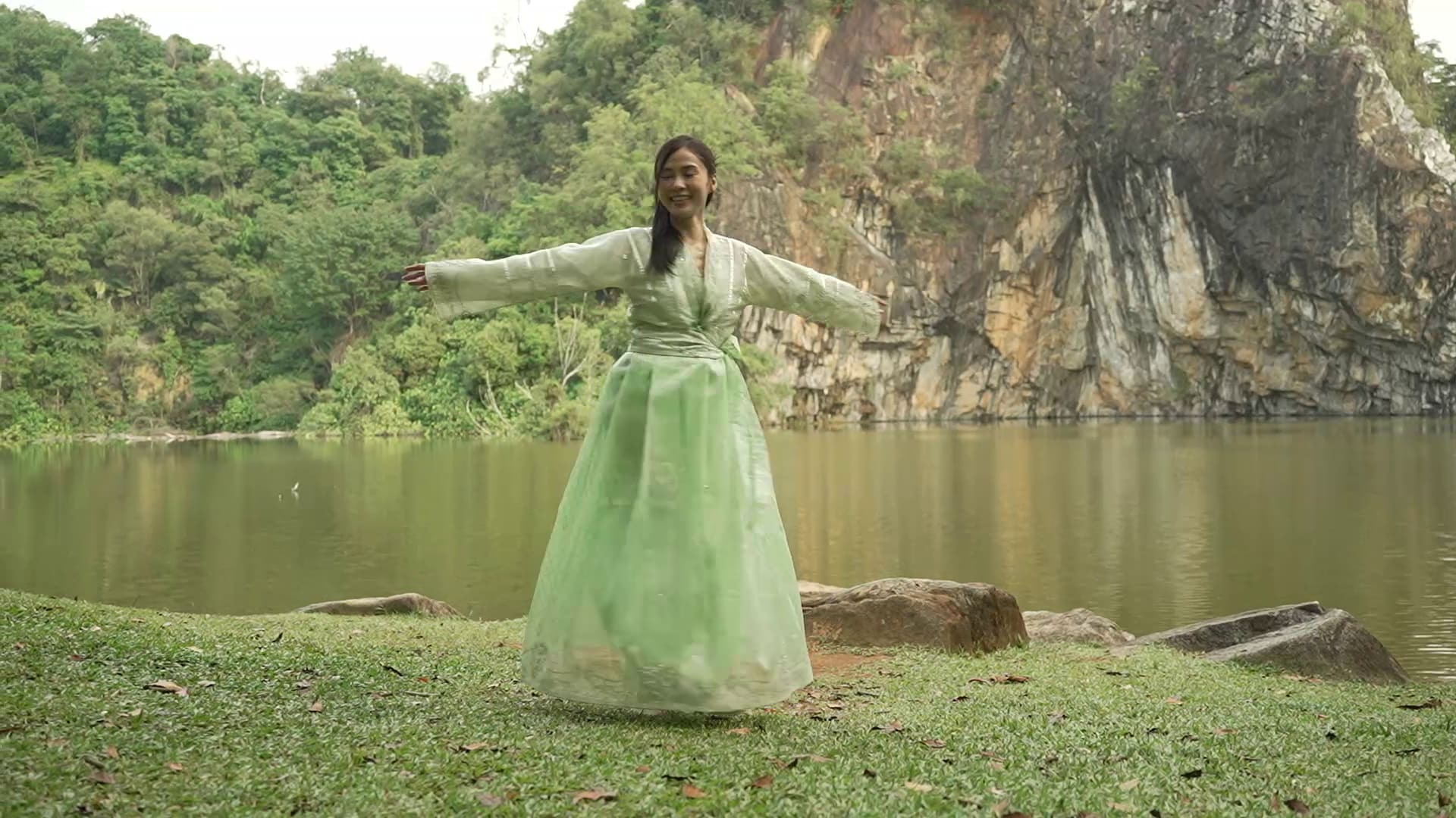 郑六月换上古装到武吉巴督小桂林,为AI歌曲拍摄MV。