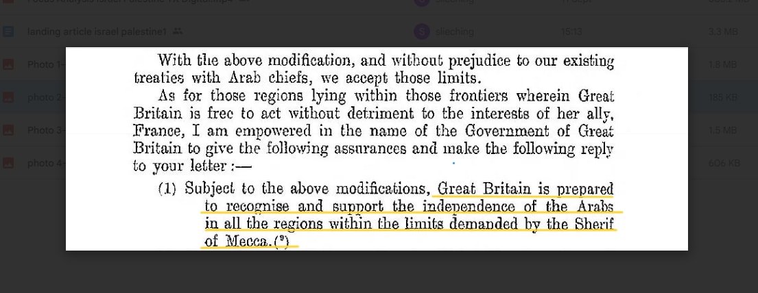 《麦克马洪-侯赛因通信》。英国政府同意如果麦加领袖发起反抗奥斯曼帝国的阿拉伯起义,作为交换英国将在战后承认阿拉伯独立。