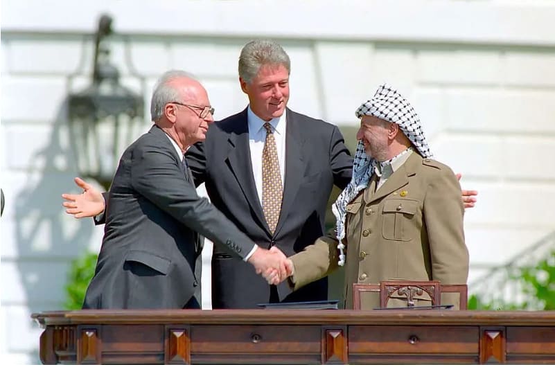 1993年时任美国总统克林顿斡旋下,以色列总理拉宾和巴勒斯坦解放组织主席阿拉法签署《奥斯陆协议》