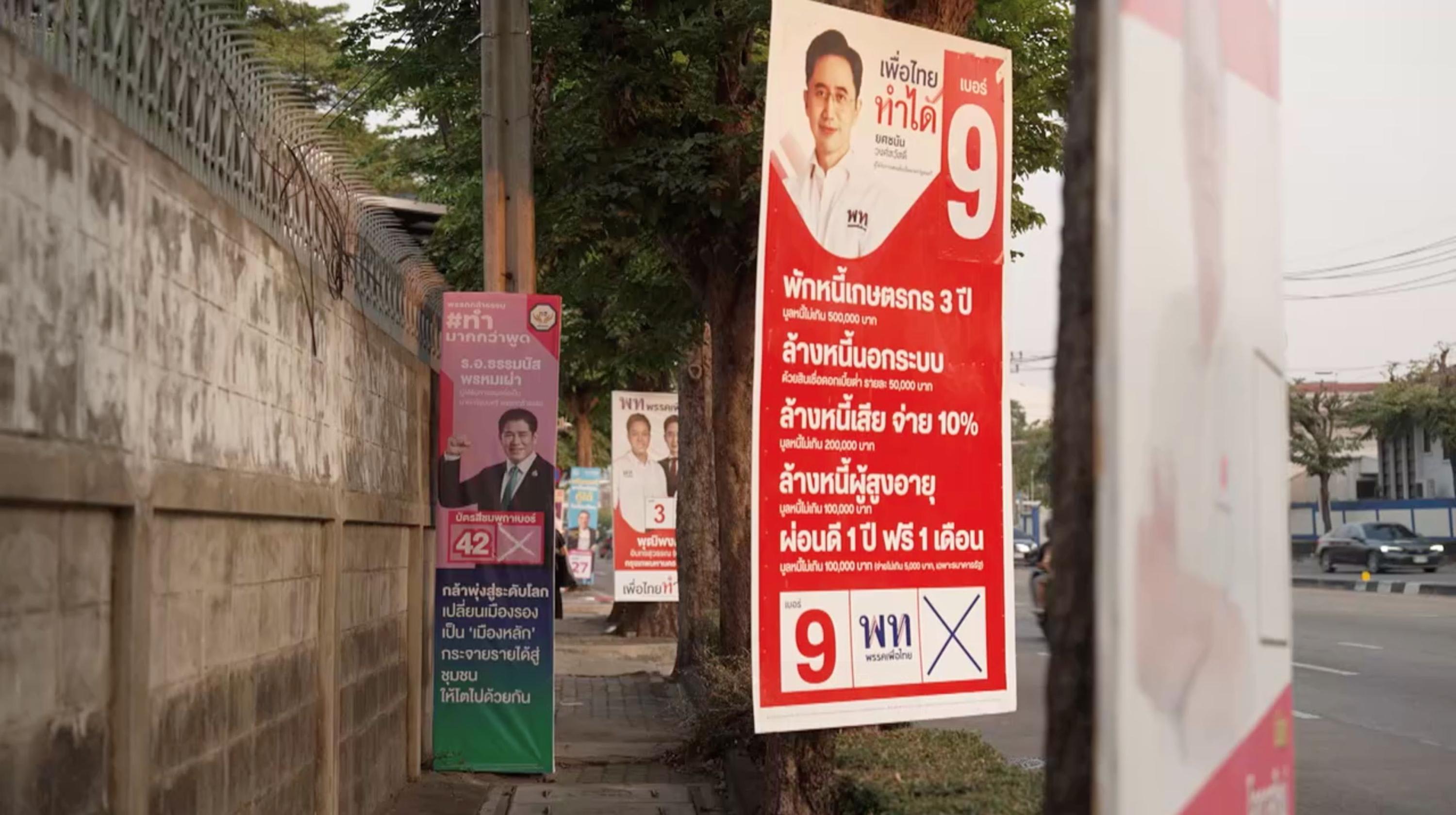 大选即将来临,泰国街景出现各政党横幅。
