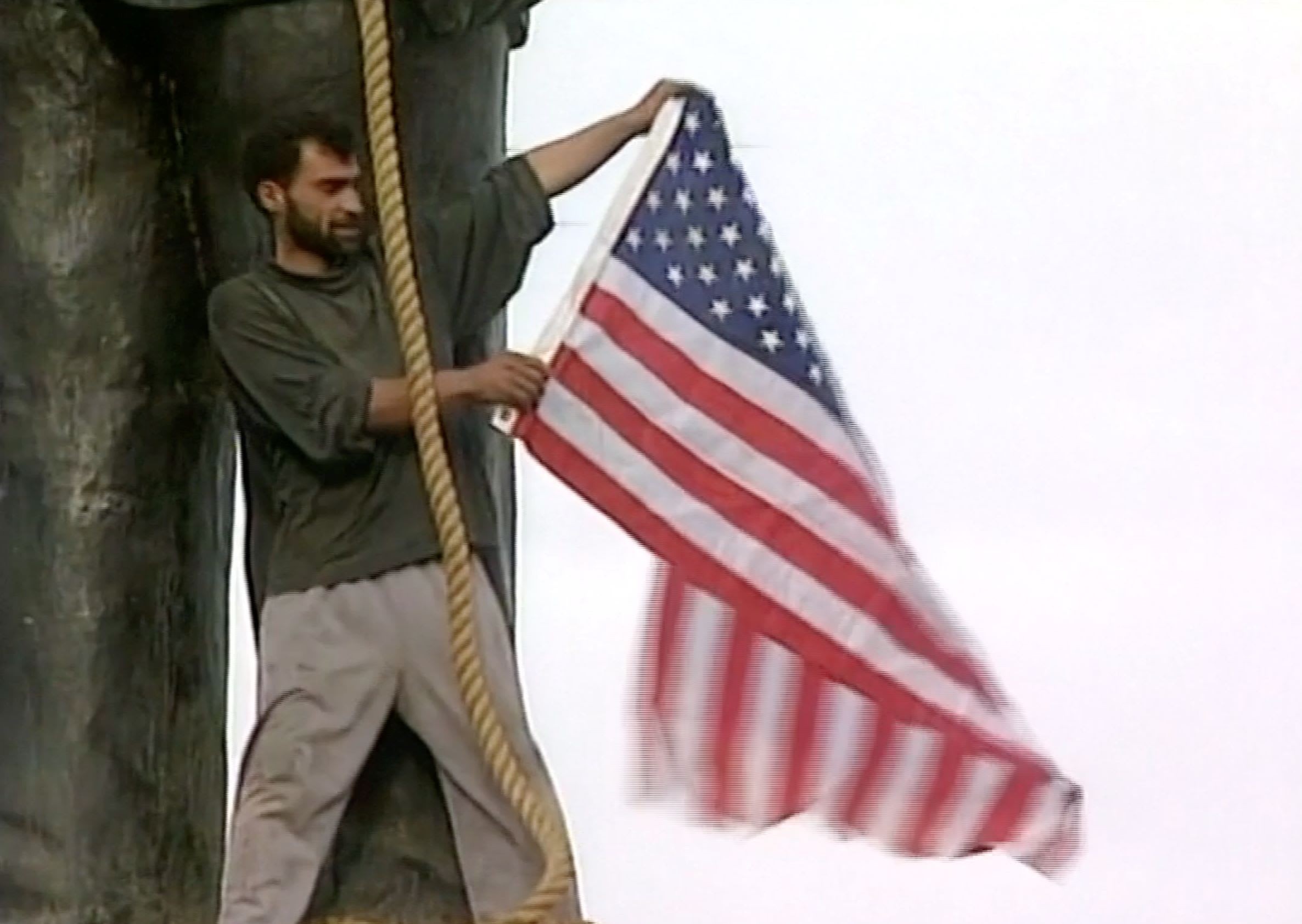 2003年,美国进军伊拉克成功推翻萨达姆政权,民众高举美国旗帜庆祝。