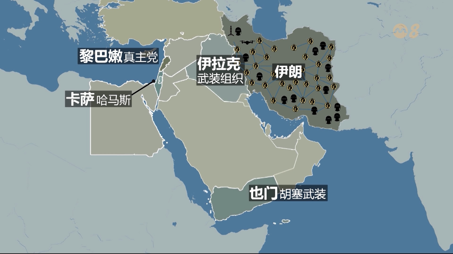 伊朗通过所谓的“抵抗轴心”,支持多个地区武装力量,包括: