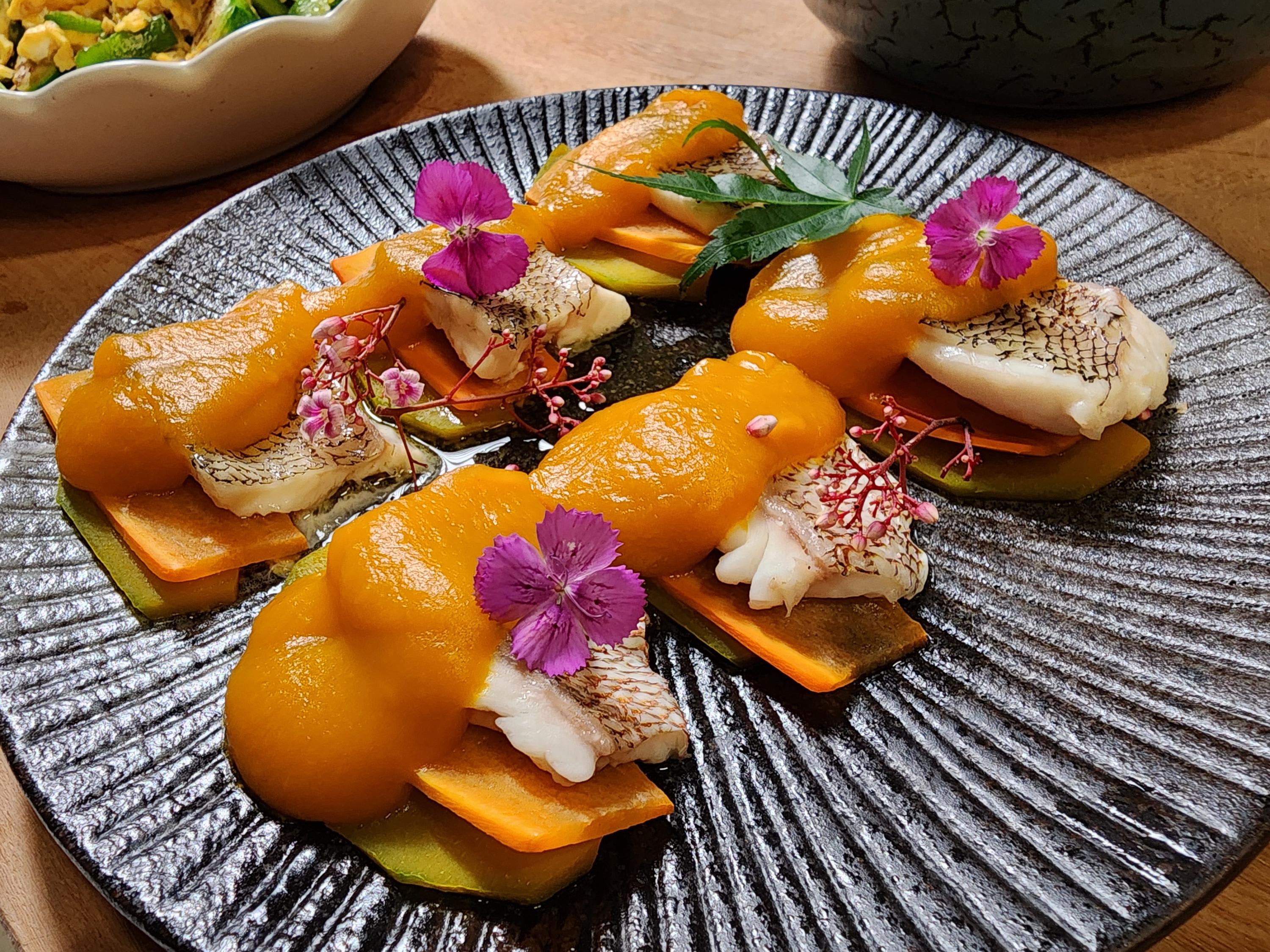 先将南瓜和红萝卜去皮,切成薄片,将去骨后的鱼片和南瓜片、红萝卜排好,蒸约10分钟。用中火蒸鱼片,等水开后将鱼片放入蒸锅,接着将其余的南瓜和红萝卜放入蒸锅,蒸熟后打成泥。加入适量的蚝油调味料做成酱汁,淋在鱼片上就可以上桌了。