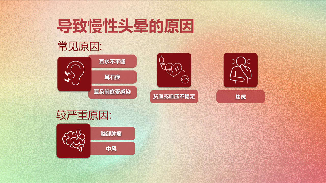 吴医生表示,慢性头晕最常见的原因与耳朵问题有关,包括耳水不平衡(Meniere's disease)、耳前庭感染和耳石症,也就是良性阵发性位置性眩晕(BPPV)。此外,贫血、身体水分不足导致的血压不稳,也可能引发头重脚轻的感觉。他也提到,头晕可能让人觉得焦虑,焦虑本身又可能造成头晕,焦虑情绪和头晕或因此形成恶性循环。 一些情况下,脑部肿瘤或中风也可能导致慢性头晕。