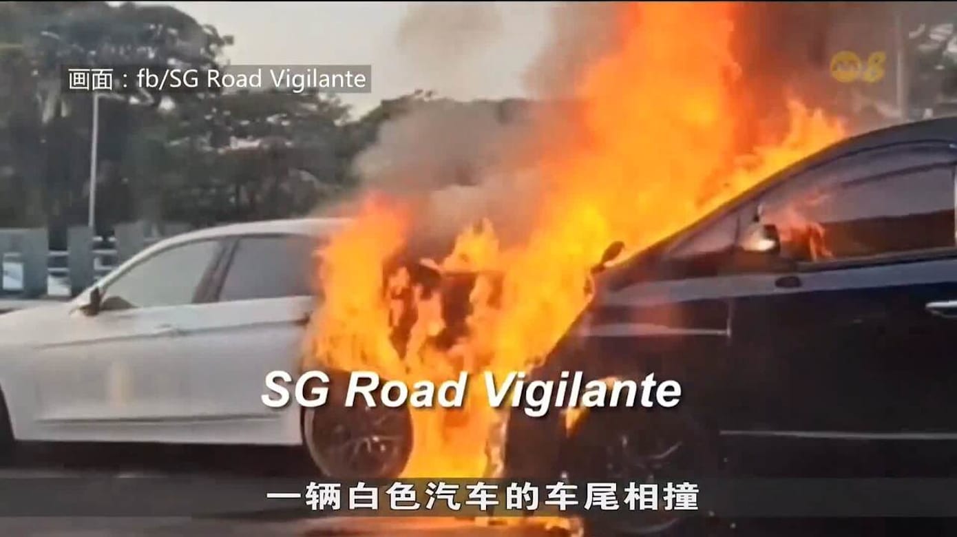 泛岛快速公路今早疑似发生车祸 两车PIE相撞起火燃烧仅剩车架